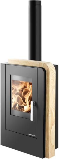 Krbová kamna Haas+Sohn Nordby v provedení černý plech + obklad Woodstone Prestige (přírodní kámen) mají výkon regulovatelný v rozmezí 2–6.4 kW.