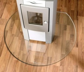 Sklo pod kamna,tvrzené čiré,odolné vůči vysokým zátěžím. Broušená fazeta na nášlapných hranách eliminuje možnost zakopnutí o hranu.